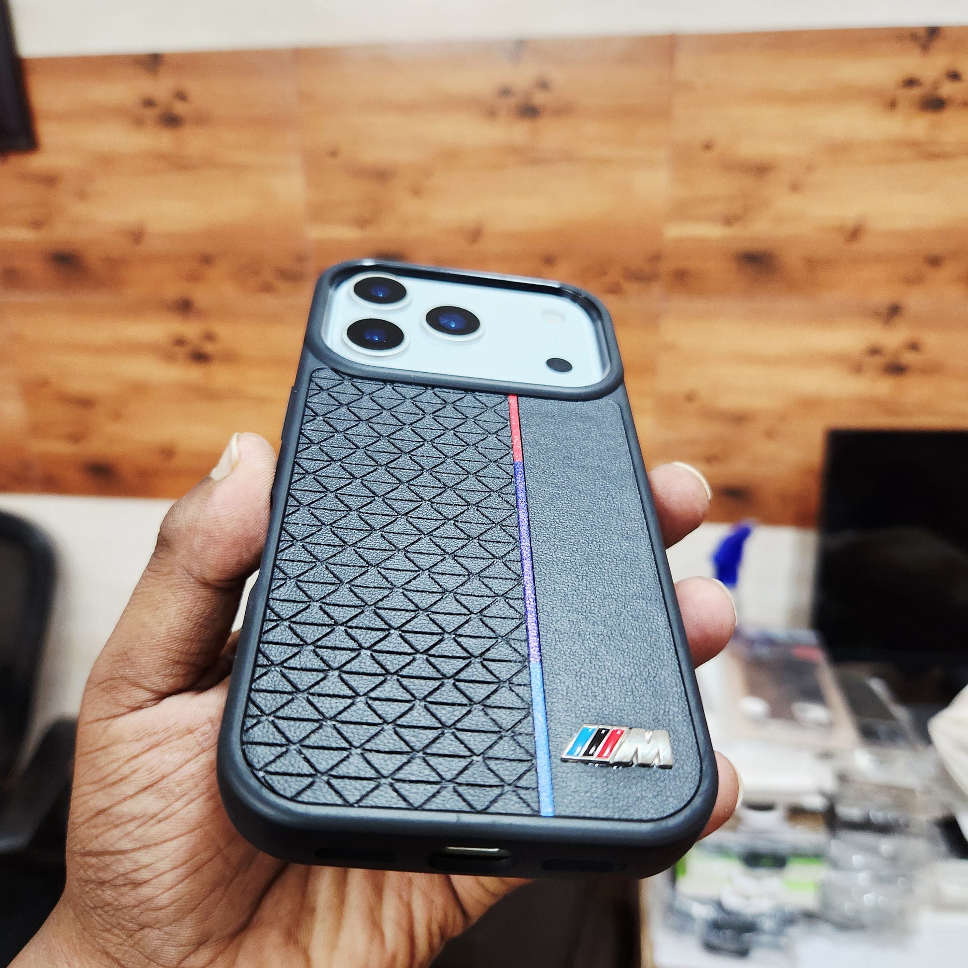 iPhone 17 Pro Back Cover Luxury Sports Car Logo Leather Case - Black
