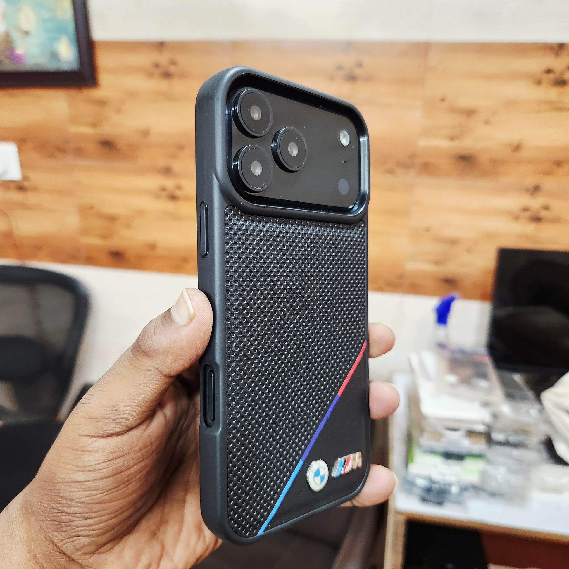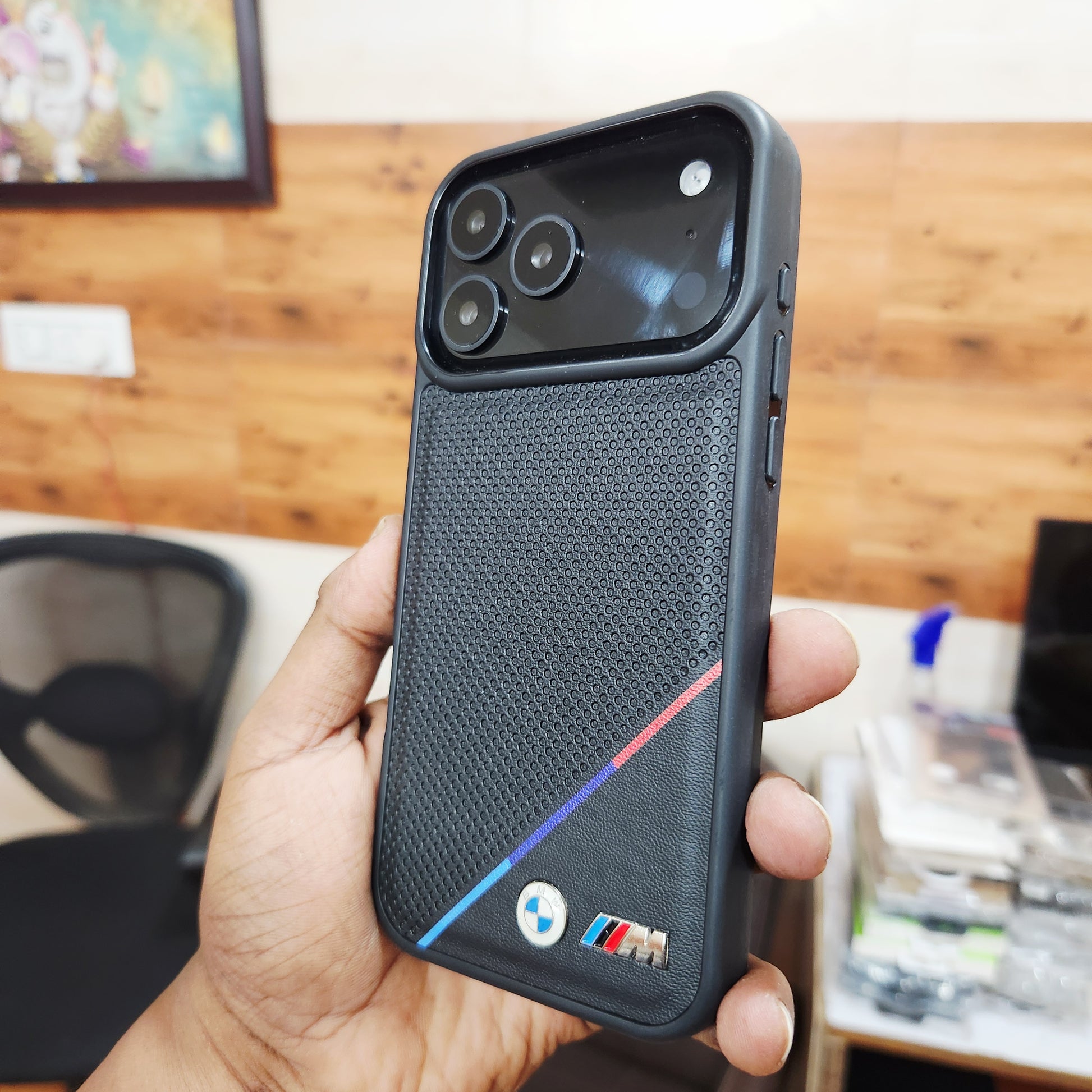 iPhone 17 Pro Max Leather Case Luxury Dot Pettern with Sports Car Logo - Black