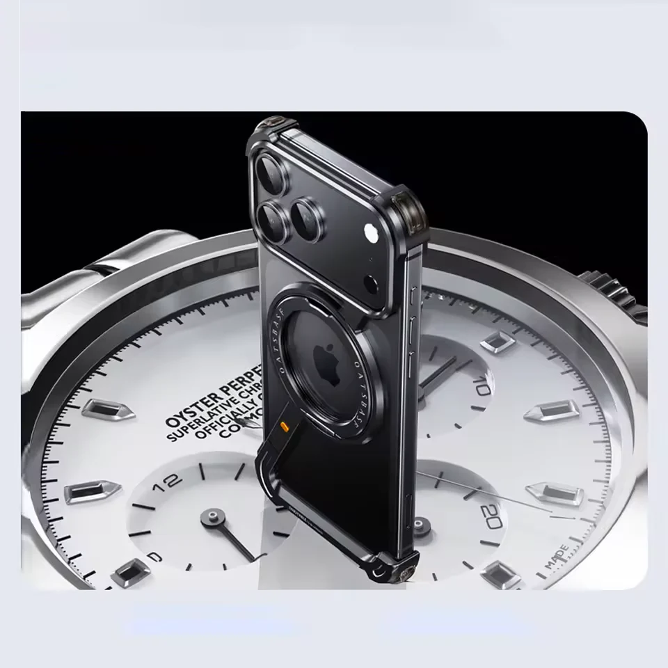 iPhone 17 Pro Max Z Shape Frameless Metal Bumper Case with 360° Rotatable Stand & Magsafe - Black