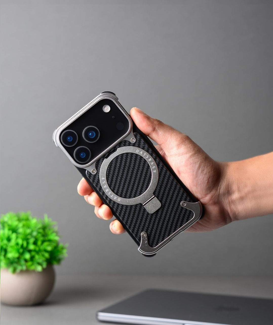 Meet the Titan Carbon Metal Case - engineered to survive life’s knocks while turning heads. Its carbon-reinforced core provides rigid structural strength, while the CNC-machined metal bracket and ring deliver rock-solid protection and a confident grip.